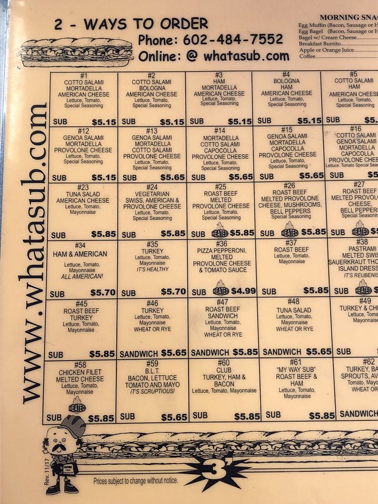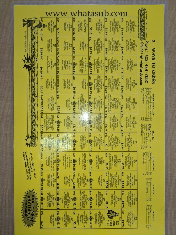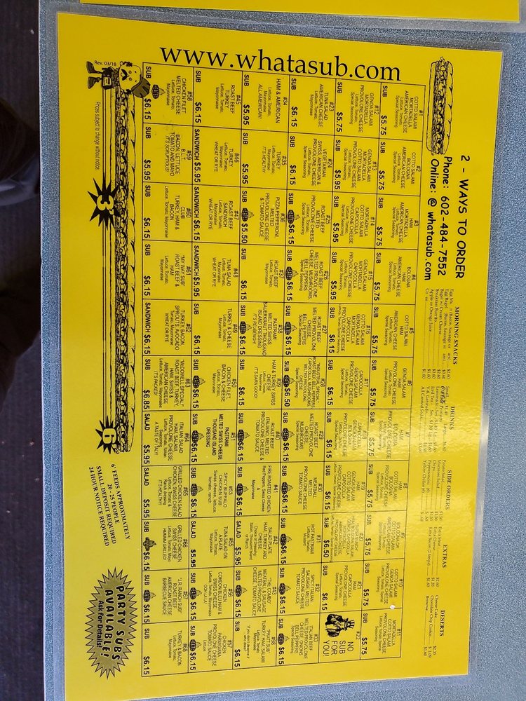 Introducing the menu at WHAT-A-SUB, a delightful sandwich haven located in Phoenix, AZ. This charming spot serves an impressive array of sandwiches that cater to every palate. For breakfast, indulge in their English Muffins or Jalapeno Bagels topped with eggs and your choice of savory meats. The main offerings feature crowd-pleasers like Tuna Salad and Hot Pastrami, all served on fresh bread that customers rave about.